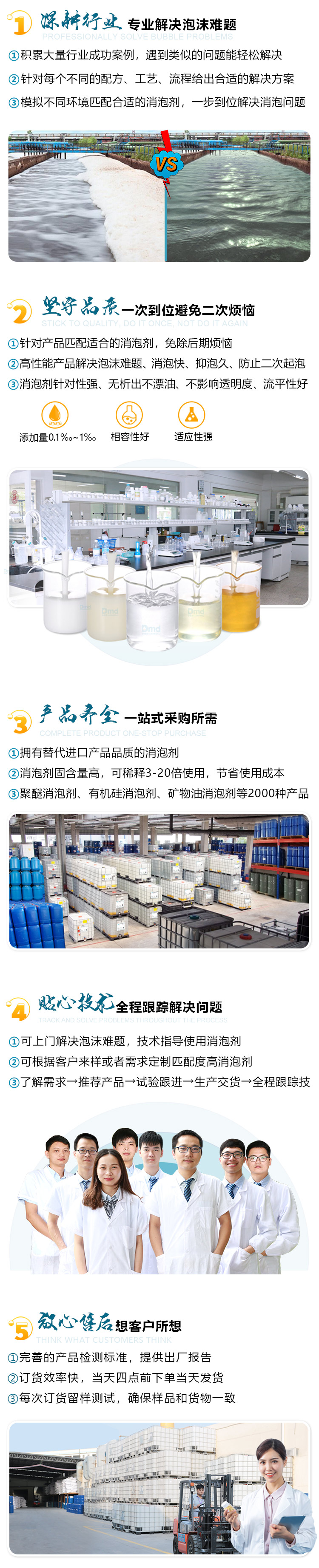 多年來(lái)公司面向市場(chǎng),面向真實(shí)各行業(yè)客戶現(xiàn)場(chǎng),對(duì)水處理消泡劑、工業(yè)消泡劑、有機(jī)硅消泡劑、發(fā)酵行業(yè)、清洗劑行業(yè)、金屬加工行業(yè)、造紙行業(yè)、建材行業(yè)、水性粘合劑行業(yè)、紡織印染行業(yè)、油田行業(yè)、水性涂料行業(yè)、印刷材料行業(yè)、電廠脫硫行業(yè)、工業(yè)清洗行業(yè)、家用化學(xué)品行業(yè)、采礦選礦工行業(yè)等32個(gè)行業(yè)工藝、流程及產(chǎn)品配方深入了解,對(duì)各行業(yè)消泡劑應(yīng)用了如指掌,給能客戶提供合適的解決方案,所研發(fā)生產(chǎn)消泡劑適應(yīng)客戶需求和市場(chǎng)需要,能輕松解決客戶遇到的難以解決的消泡難題,減少了客戶使用消泡劑的成本。公司依托完善的售前、售中及售后服務(wù),全程技術(shù)跟進(jìn)消泡劑的試樣到使用過(guò)程,節(jié)省了時(shí)間和成本,贏得了業(yè)界各類(lèi)客戶們的贊譽(yù)!